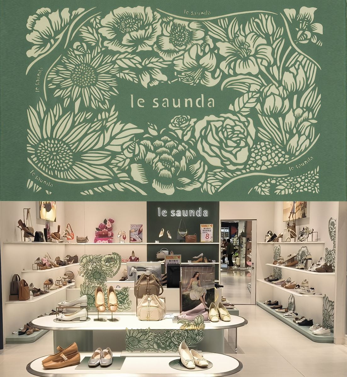 2023年秋冬季莱尔斯丹联合佛山非遗剪纸传承人张颖莹老师,以「心旅人」为主题,采用传统剪纸技艺与莱尔斯丹鞋盒特有的环保纸张进行艺术共创,推出《心旅繁花》品牌TVC及全国店铺主题陈列,倡导女性自主自立。
