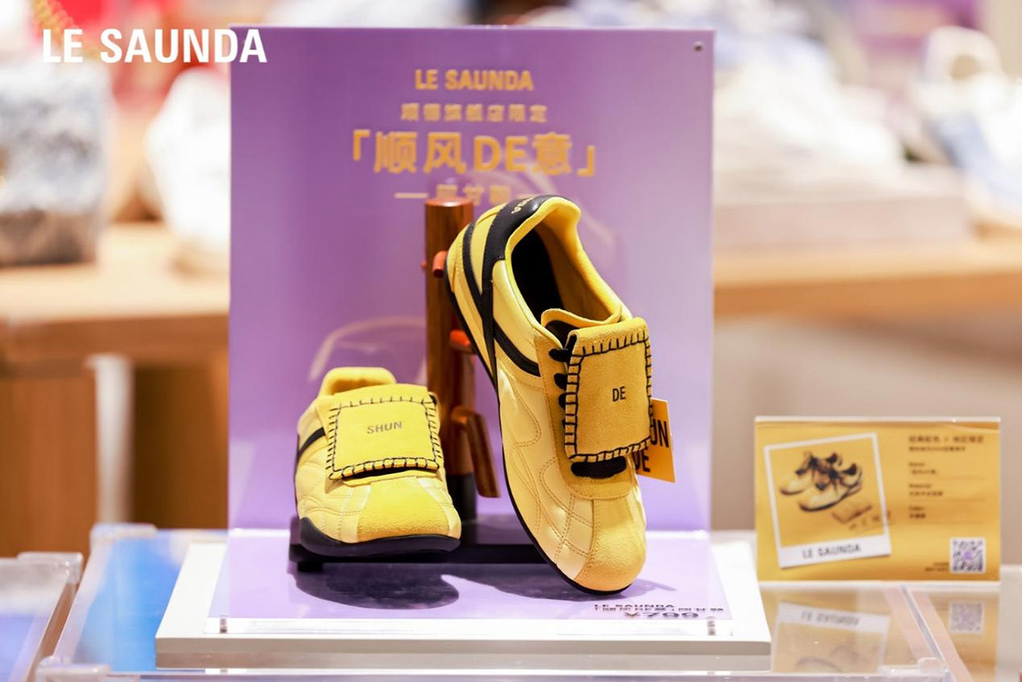 此外,服务体验升级亦是该旗舰店的一大亮点,导购团队转型为专业搭配师,为顾客提供从入店到离店的一对一专属服务,营造宾至如归的购物氛围。店内特设“活动Corner”,将不定期举办DIY工坊、会员沙龙等活动,同时计划引入3D打印会员专属鞋垫等创新技术设施,将传统零售空间升级为互动体验中心,为顾客带来全新的购物感受。品牌深度融合顺德文化,限量推出顺德地区限定款‘顺风DE意’阿甘鞋。该鞋款以黑黄撞色设计致敬岭南武术文化,鞋面定制‘SHUN DE’字样,镌刻城市文化基因,以可穿戴的文化符号诠释品牌的匠心传承与革新魄力,成为文化与时尚完美结合的典范。