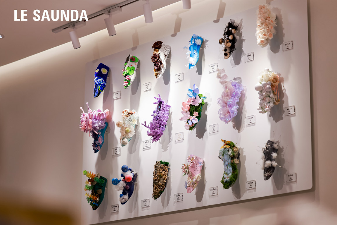 旗舰店以“溯源与焕新”为核心理念,在空间设计、服务体验和文化融合三个维度实现了全面升级。在空间设计方面,门店完成品牌VI,SI的焕新升级,以品牌理念「悦己无限,创新无界」为指引,独具匠心地用无限符号打造中央展台,成为店内的一大视觉亮点。店内艺术墙上悬挂的艺术鞋楦装置更是吸引众人目光——这些作品源自莱尔斯丹与顺德李伟强职业技术学院联合举办的“创意无限,传承顺德——环保共创莱尔斯丹”鞋楦艺术设计大赛,以废旧鞋楦为创作素材,充分展现了创新传承的独特魅力。